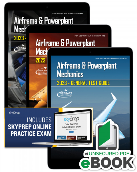 Test Guides are a great help to your learning experience. They are an excellent way to review the material learned in the classroom and/or from the various textbooks. ATB Test Guides include sample test questions along with answers, detailed explanations, and page references to that topic in the 8083-B General, Airframe, and Powerplant Handbooks. Use them to verify your knowledge of each topic and to prepare for the FAA exams.